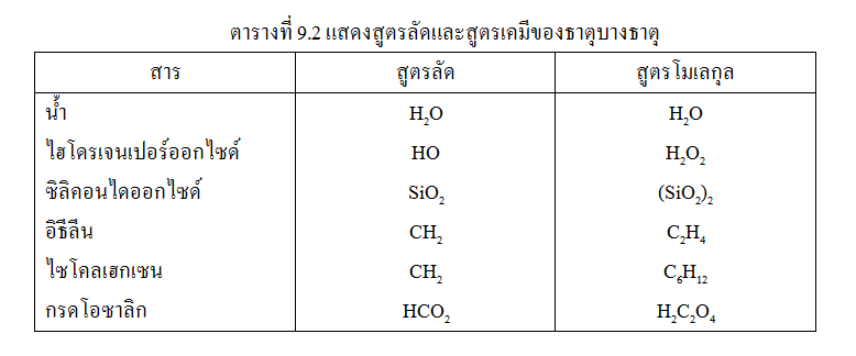 1.สูตรเคมี (Chemical Formulas) สารประกอบทางเคมีของธาตุต่าง ๆ ปกติจะแสดงในรูปสั้น ๆ ทีเรียกว่า “สูตรเคมี” สูตรเคมีนั้นมีสองอย่างด้วยกัน อย่างแรกคือ “สูตรลัด” ประกอบด้วยอัตราส่วนอย่างง่ายของอะตอม หรือจำนวนตัวเลขน้อยที่สุดที่สามารถเขียนได้อย่างที่สองคือ “สูตรโมเลกุล” ประกอบด้วยจำนวนตัวเลขที่แน่นอนของอะตอมในโมเลกุล เช่น น้ำจะมีทั้งสูตรโมเลกุลและสูตรลัดเหมือนกันคือ H2O แต่ไฮโดรเจนเปอร์ออกไซด์จะมีสูตรลัดเป็น HO และมีสูตรโมเลกุลเป็น H2O2 เมื่อต้องการบอกความหมายจะใช้สูตรโมเลกุล เพราะว่าสูตรโมเลกุลจะบอกทั้งอัตราส่วนของอะตอมและจำนวนจริงของอะตอม