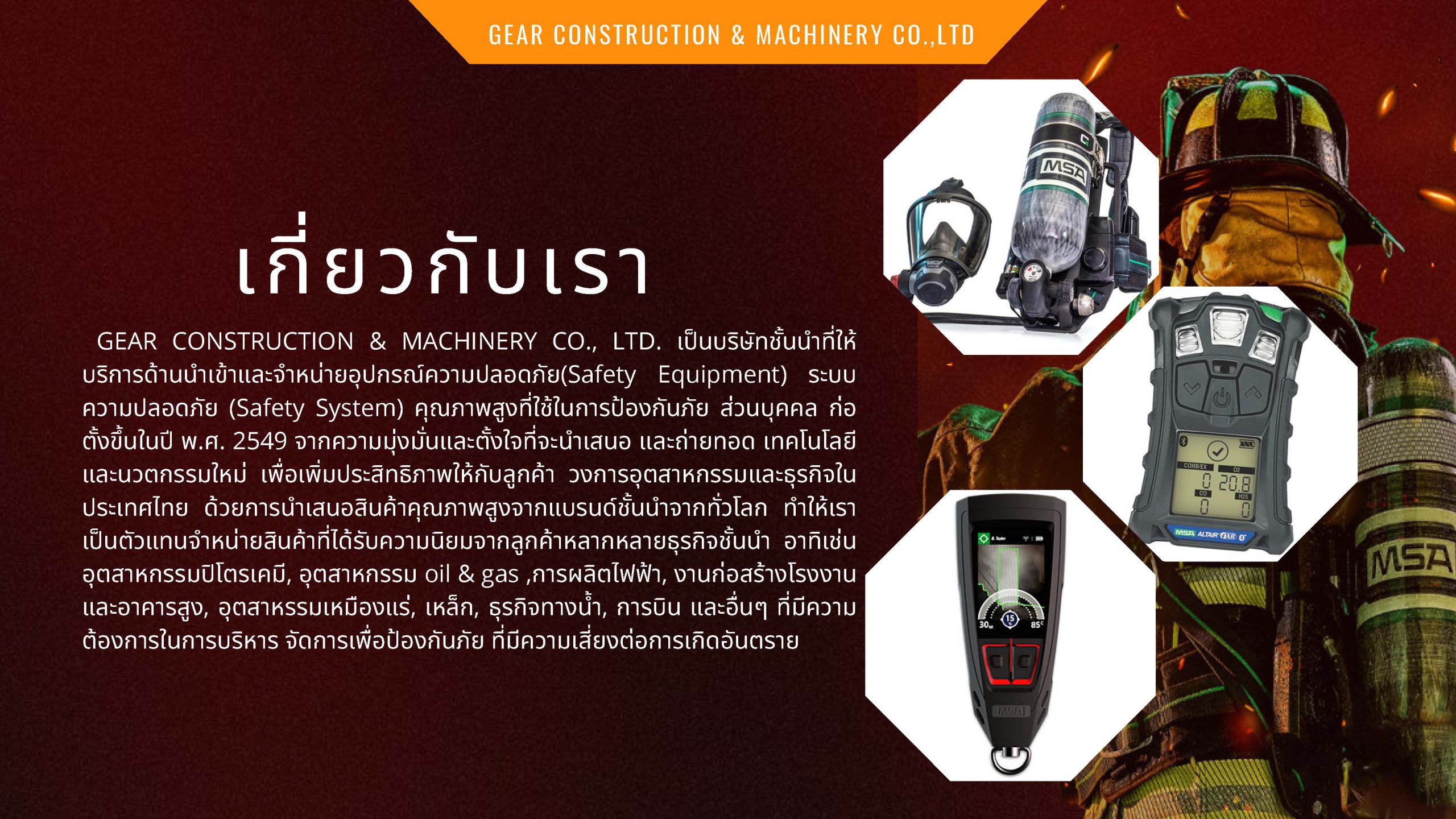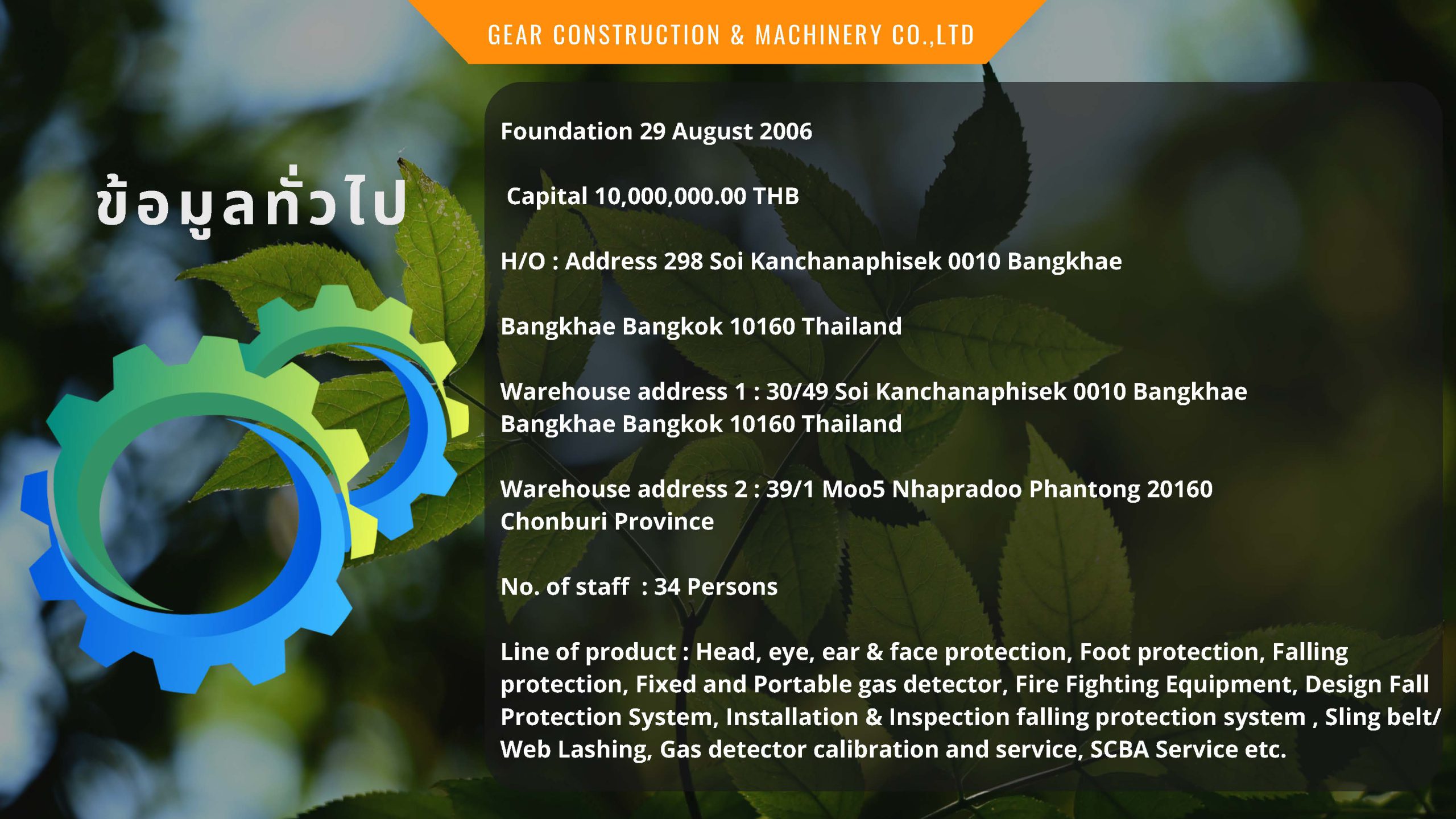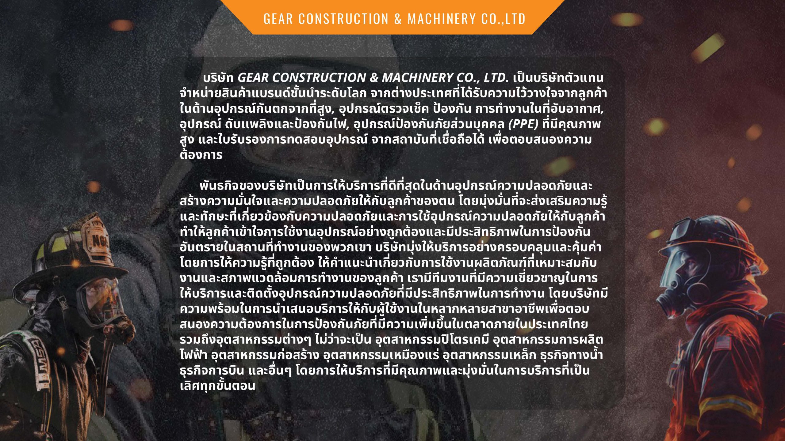 บริษัท เกียร์ คอนสตรัคชั่นแอนด์แมชชีนเนอรี่ จำกัด เป็นบริษัทที่ก่อตั้งและจดทะเบียนนิติบุคคลเมื่อวันที่ 29 สิงหาคม 2549 โดยมีทุนจดทะเบียนรวมทั้งสิ้น 10,000,000 บาท ซึ่งเราเป็นตัวแทนจำหน่ายอุปกรณ์ความปลอดภัยที่ได้รับการรับรองมาตรฐานระดับโลกอย่างเป็นทางการ ทีมงานของเรามีความเชี่ยวชาญและประสบการณ์ที่เพิ่มขึ้นในการทำงานกับแบรนด์ MSA, SAFETY JOGGER, และ PRATT ซึ่งเป็นชื่อเสียงในวงการความปลอดภัย