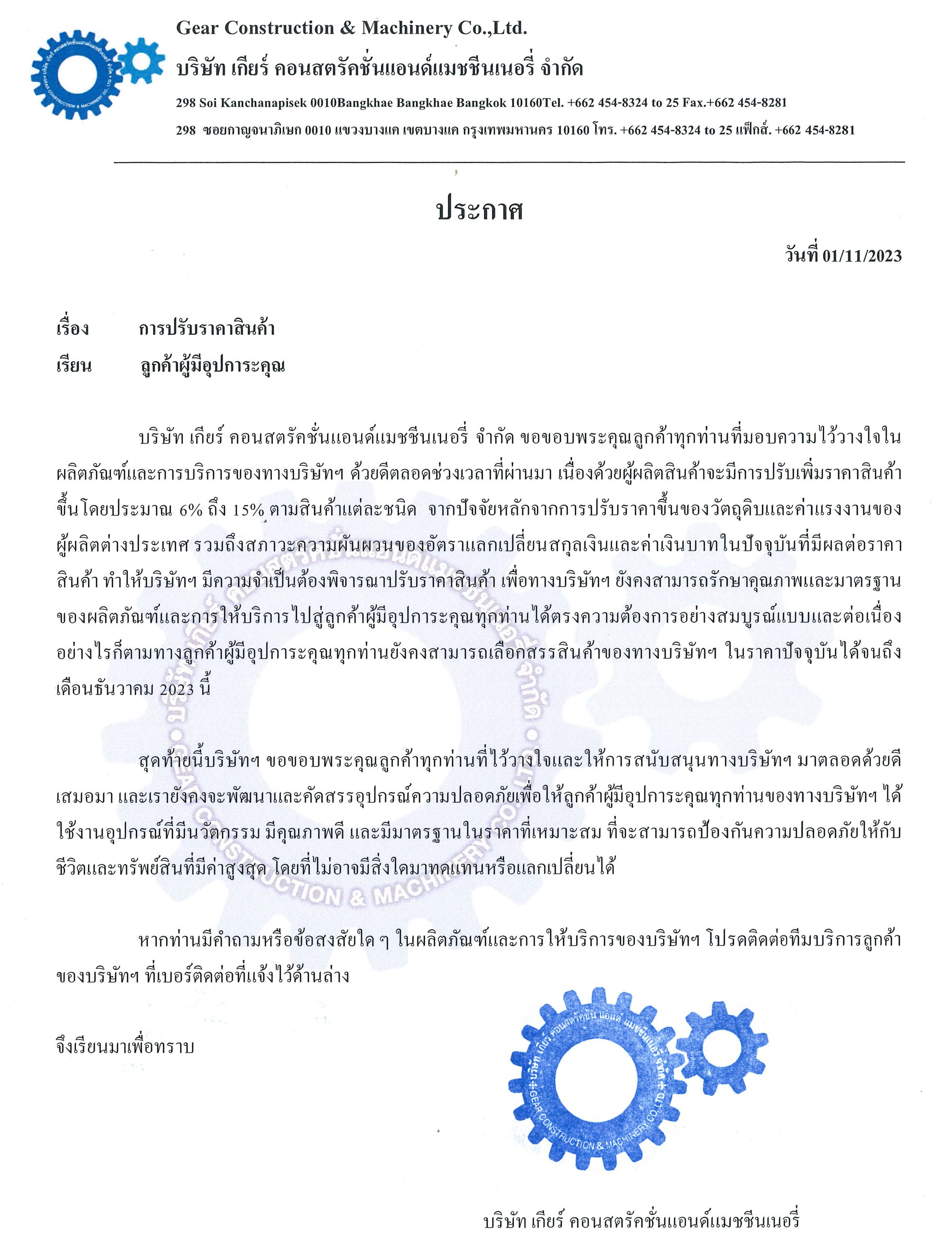 ข่าวสาร การปรับราคา บริษัท เกียร์ คอนสตรัคชั่นแอนด์แมชชีนเนอรี่ จำกัด